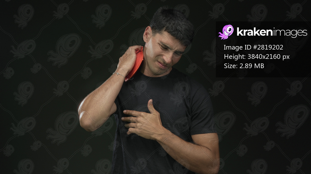 Young hispanic man pressing ice pack to neck in studio with dark green background; pain discomfort healing strain.