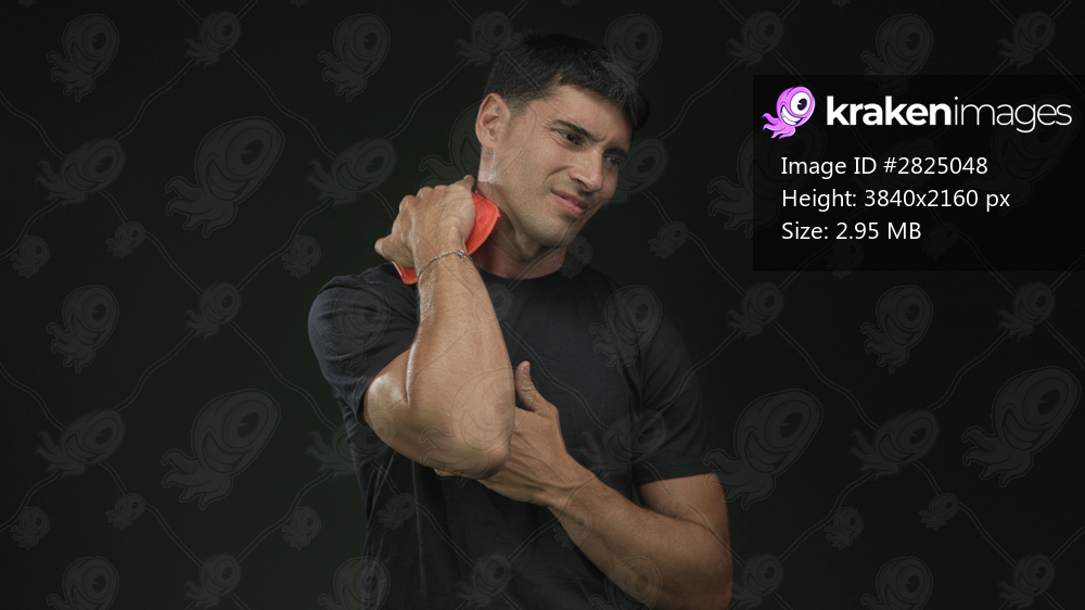 Young hispanic man pressing ice pack to neck in studio with dark green background; pain discomfort healing strain.
