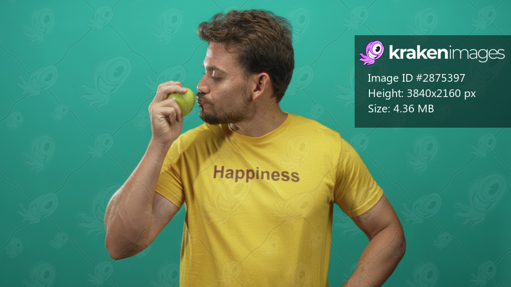 Young hispanic man puckering lips while holding a green apple in hand in teal studio confident; healthy happiness.