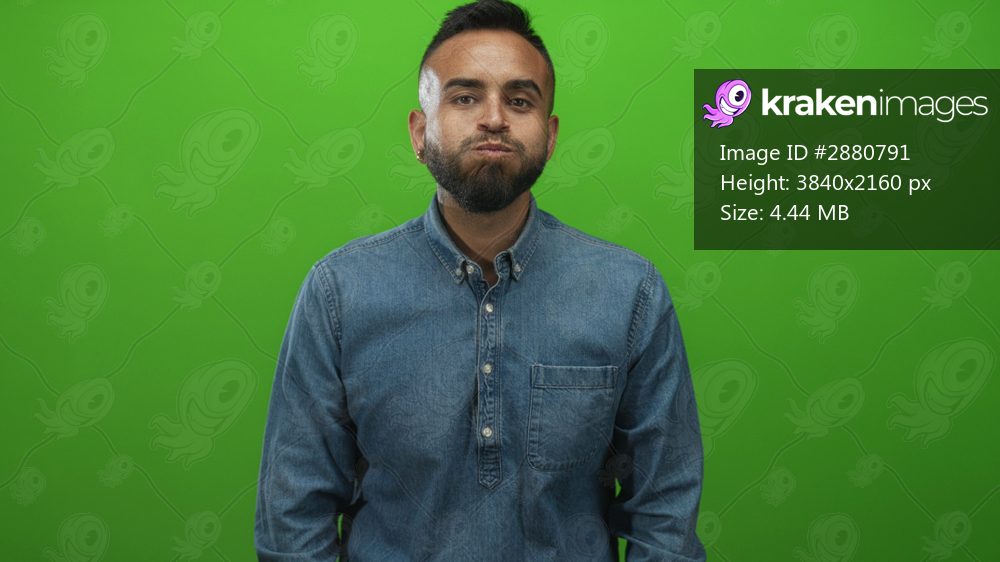 Young hispanic man with puffed cheeks and beard pointing both index fingers while wearing denim shirt in green studio; playful amusement.