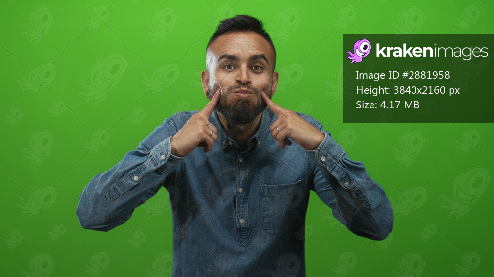 Young hispanic man with puffed cheeks and beard pointing both index fingers while wearing denim shirt in green studio; playful amusement.