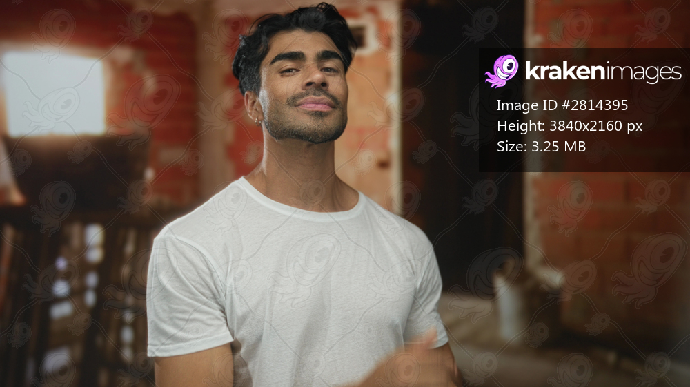 Young hispanic man pulls shirt down across chest with hands in unfinished construction building interior; confidence.