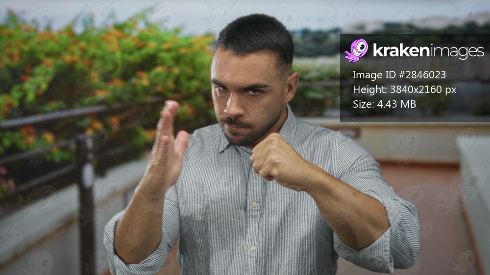 Young hispanic man punching palm with clenched fist in front of urban building facade; determination.