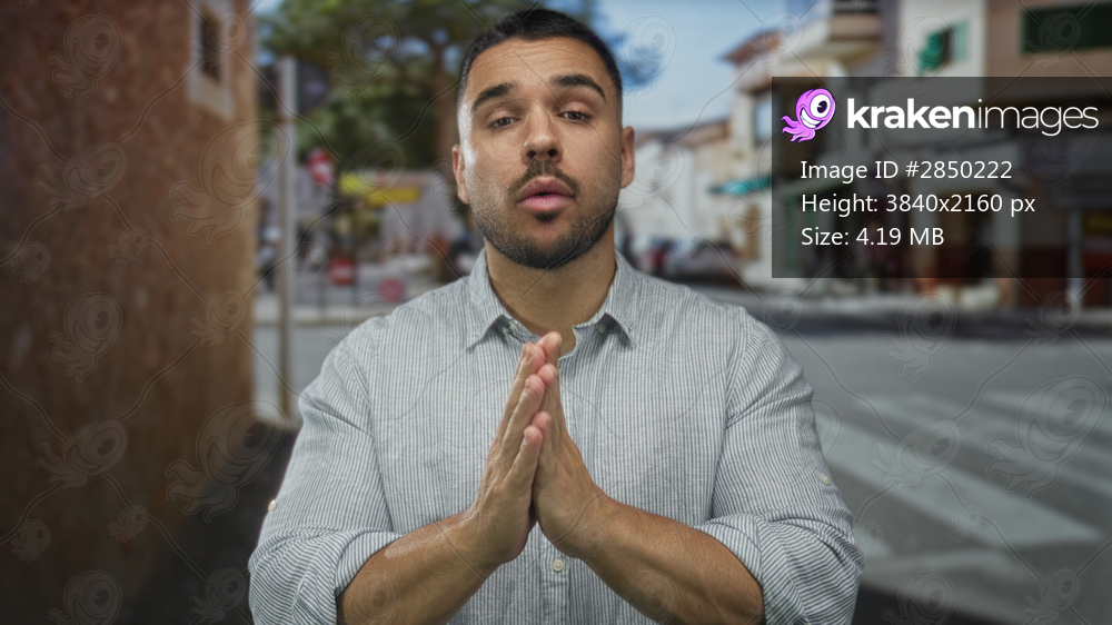 Young hispanic man pushes hands forward on bustling city street near crosswalk asking for calm; calm reassurance.