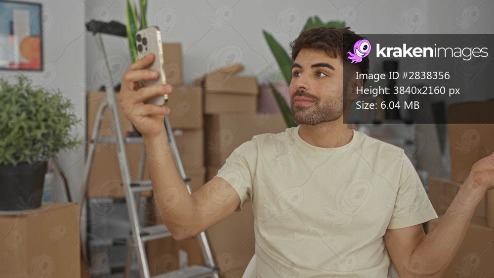 Young hispanic man raises arm holding smartphone and waves hand for video call in building; connection.