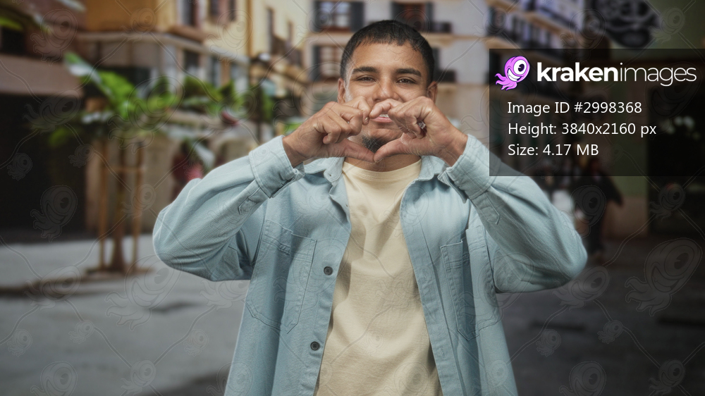 Young hispanic man raises both hands palms out wearing a light blue jacket and cream tee on a street lined with balconies and planters; friendly relaxed. - Kraken Images