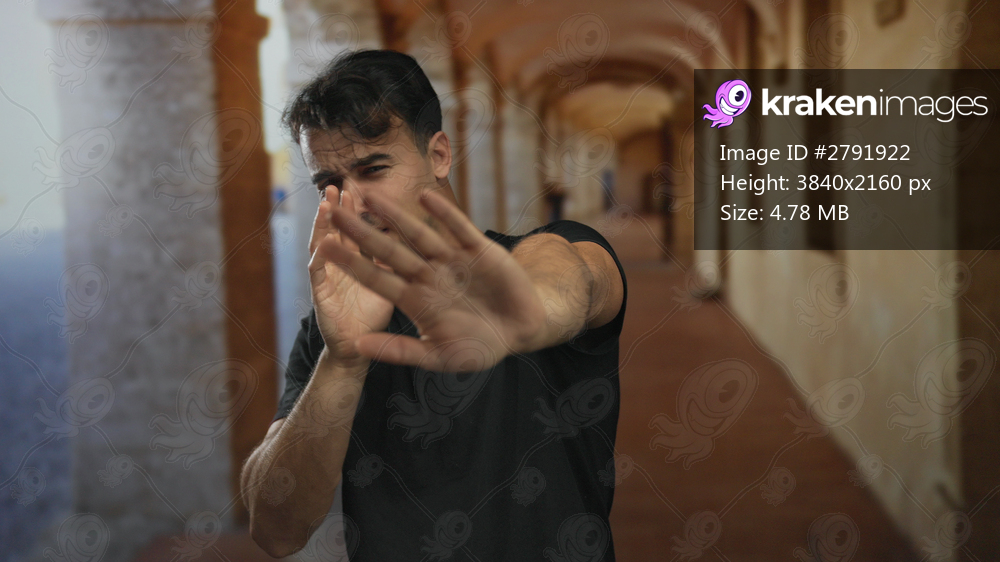 Young hispanic man raises hand in gesture of refusal standing in the archway of an old university building reflecting contemplation and emotion in an outdoor academic setting - Kraken Images