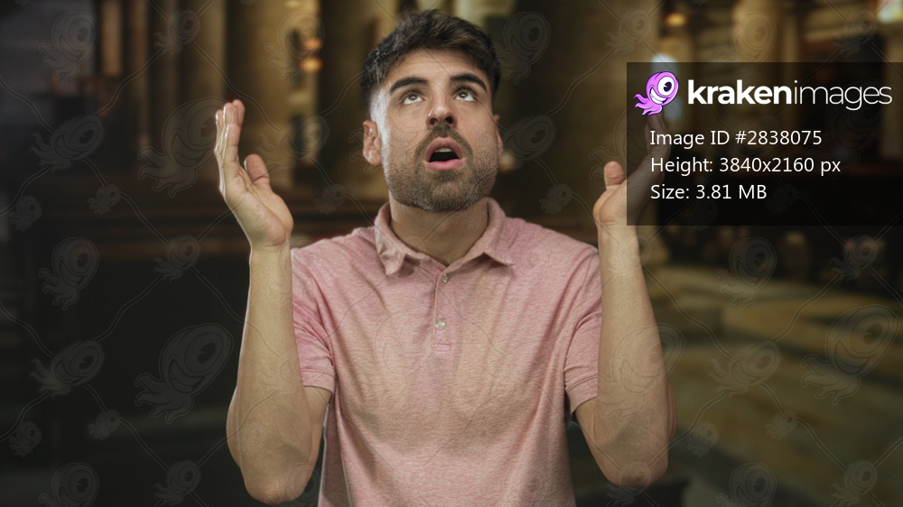 Young hispanic man raises hands in pink shirt inside church interior with wooden pews behind; devotion faith piety reverence.