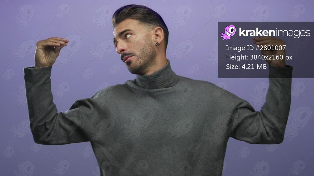 Young hispanic man raises hands in studio setting with purple color while looking upward in puzzled expression; curiosity.