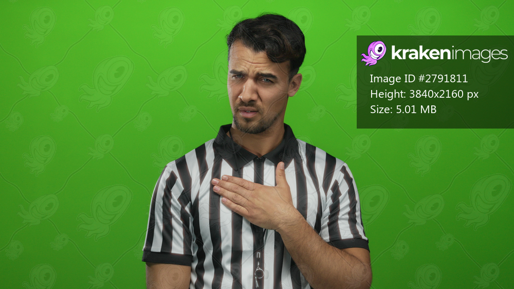 Young hispanic man referee gesturing over isolated green background with a contemplative expression, wearing a black and white striped shirt and holding a whistle. - Kraken Images