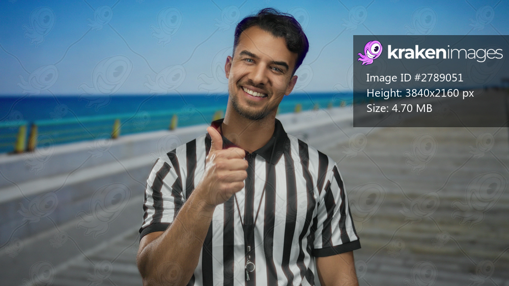 Young hispanic man referee giving thumbs up on promenade near sea outdoors.