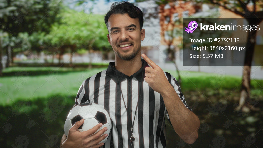 Young hispanic man referee holding soccer ball smiling outdoors in park surrounded by green trees indicating excitement about a match or game day setting. - Kraken Images