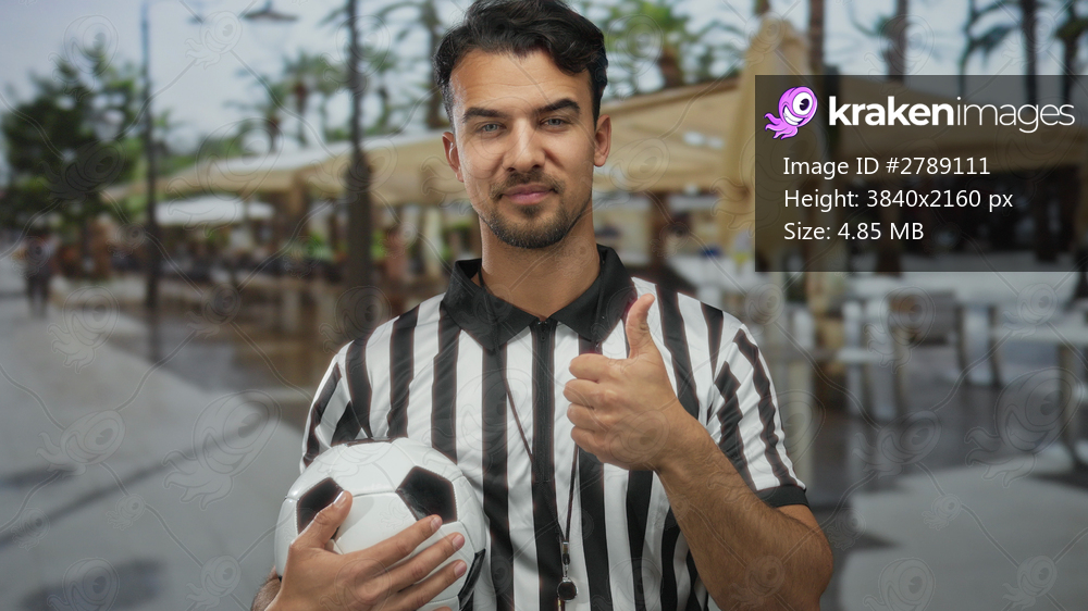 Young hispanic man referee holding soccer ball with thumbs up at outdoor restaurant terrace setting.