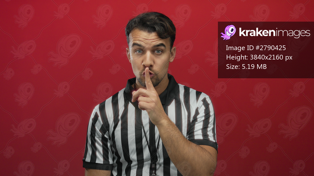 Young hispanic man referee in striped shirt making hush gesture on isolated red background conveying silence and authority.