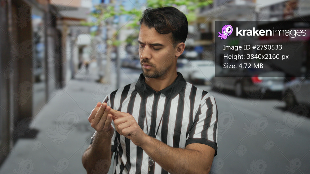Young hispanic man referee on city street counting fingers thoughtfully while standing in outdoor urban setting wearing striped shirt