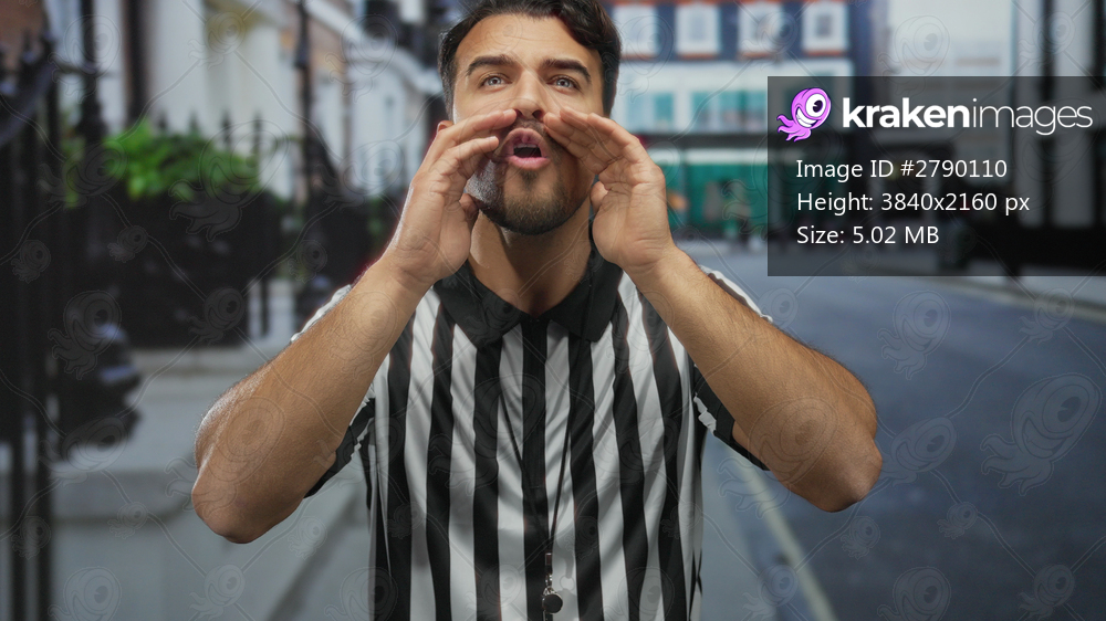 Young hispanic man referee shouting on city street wearing striped uniform during sunny day outdoors.