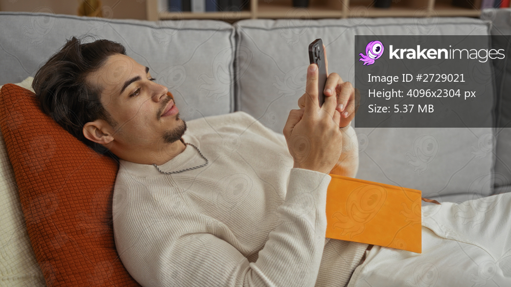 Young hispanic man relaxing at home on the sofa using a smartphone with an orange pillow beside him in a cozy apartment living room setting.