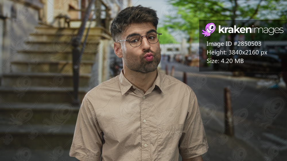 Young hispanic man with round glasses wearing beige shirt puckers lips on busy city street; playfulness.