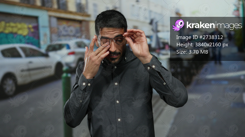 Young hispanic man rubbing eyes on an urban street with parked cars and outdoor seating, wearing glasses and a button-down shirt.