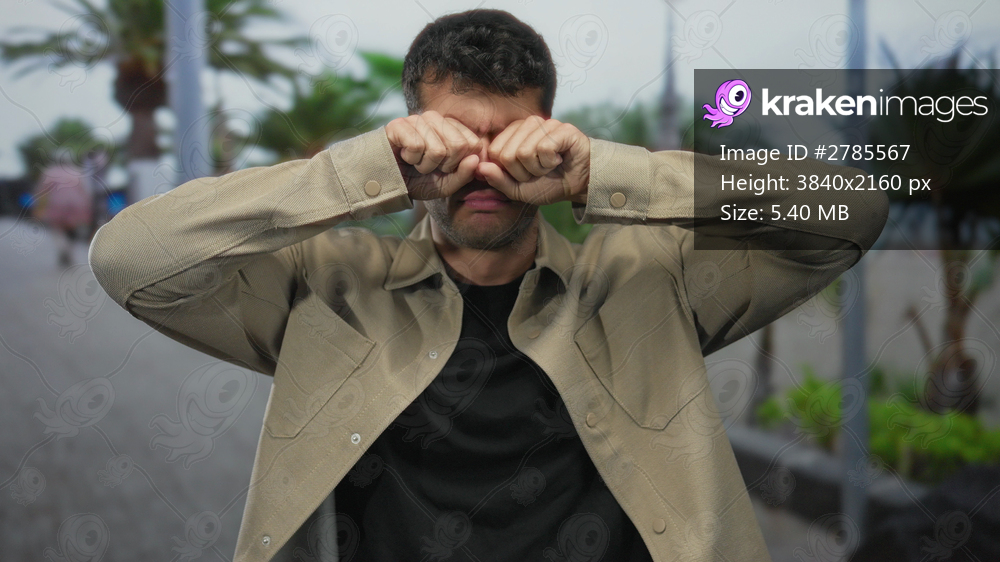 Young hispanic man rubbing eyes on boardwalk; disbelief shock.