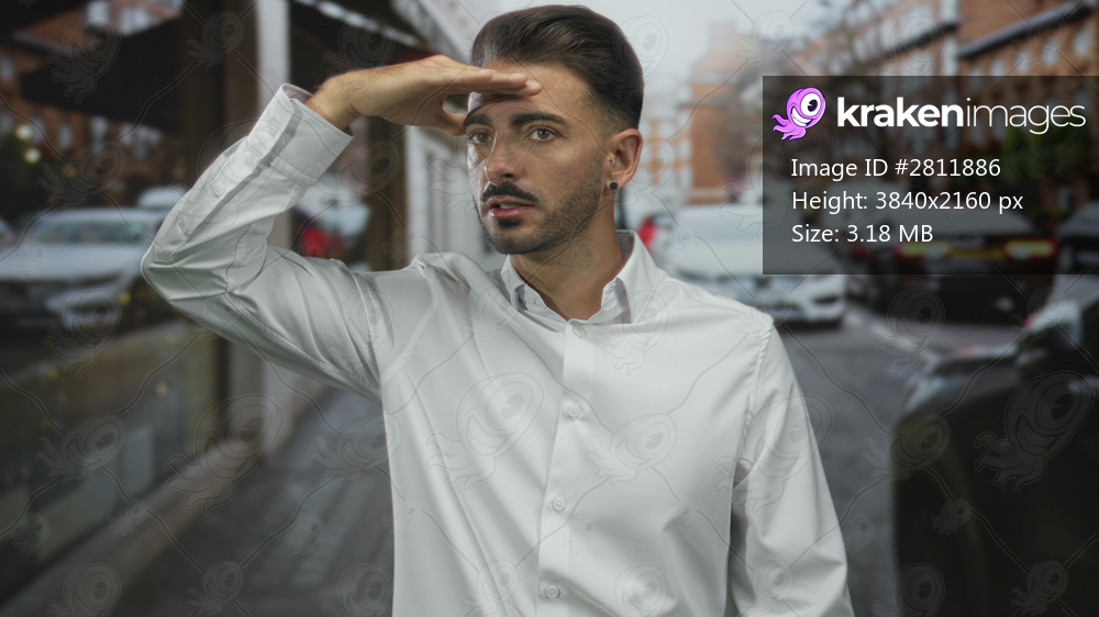 Young hispanic man shades eyes with hand while scanning traffic on a busy city street; anticipation.