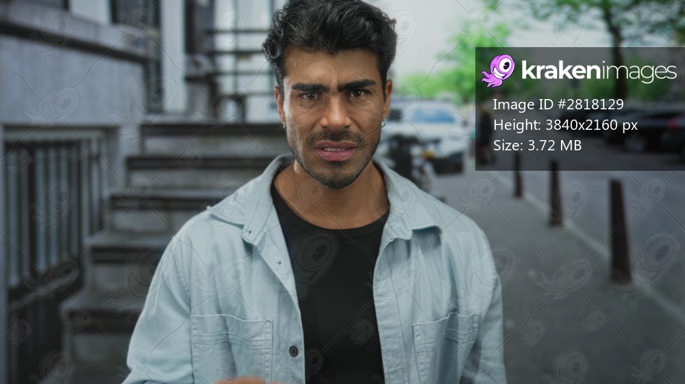 Young hispanic man shakes raised fist on urban sidewalk by stairs and parked cars in city street; anger.