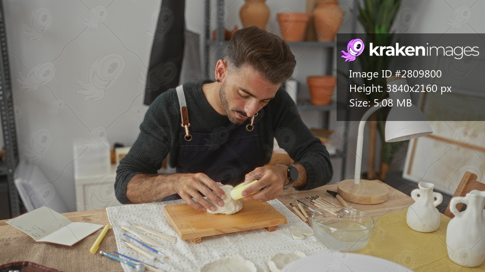 Young hispanic man shaping white clay with bare hands on wooden board in studio; concentration creativity craftsmanship.