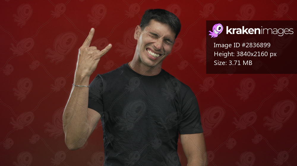 Young hispanic man with short dark hair and wide grin makes rock horns gesture with hand in red studio; fun rock energy vibe.