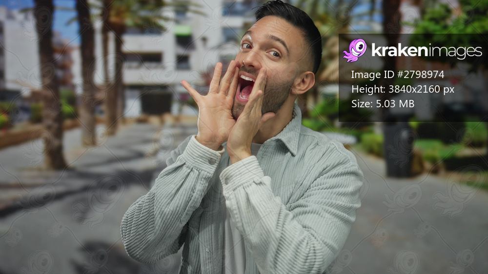 Young hispanic man shouting outdoors in a vibrant urban street with palm trees and city buildings creating a lively and dynamic urban setting.