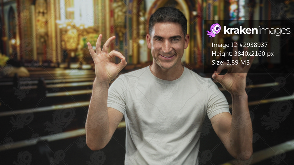 Young hispanic man showing ok sign with both hands in ornate catholic church interior, pews visible; faith approval joy.
