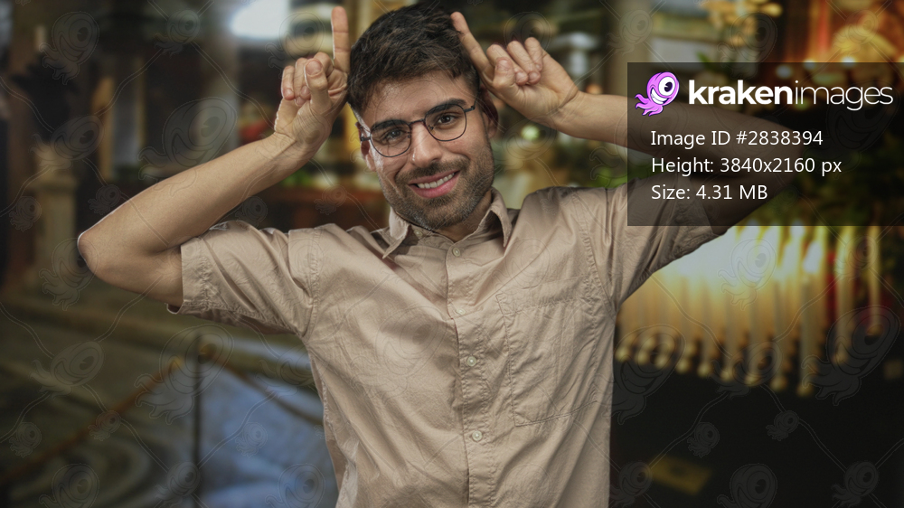 Young hispanic man showing rock horns with hands in church building; playful energy youthful spirit.