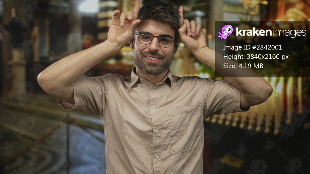 Young hispanic man showing rock horns with hands in church building; playful energy youthful spirit.