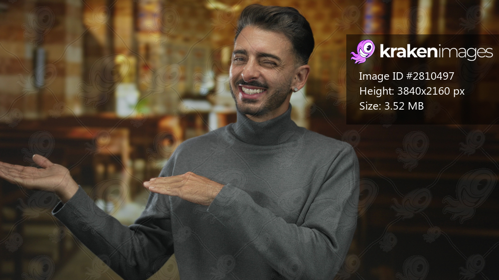 Young hispanic man showing thumbs up gesture and open palms amidst stained glass windows in church building; faith hope joy.