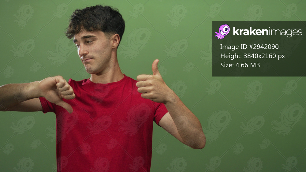 Young hispanic man showing thumbs up and thumbs down gestures in studio with green backdrop wearing red shirt, smiling and winking; ambivalence choice. - Kraken Images