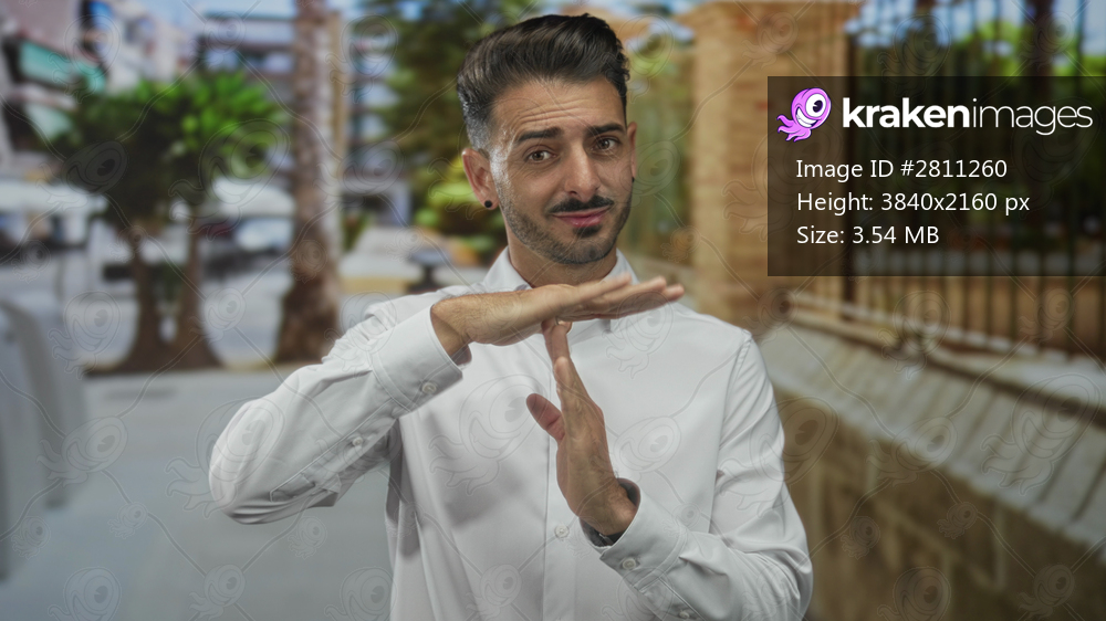 Young hispanic man shows hands in timeout gesture on city street lined with palm trees; calm reflection.
