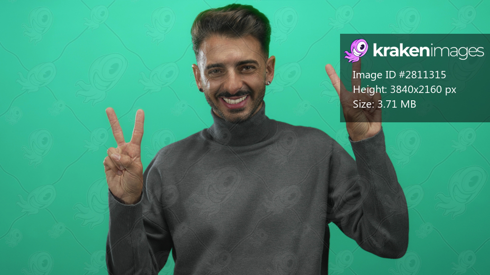 Young hispanic man shows peace sign with both hands and smiling face in studio against green wall; optimism.