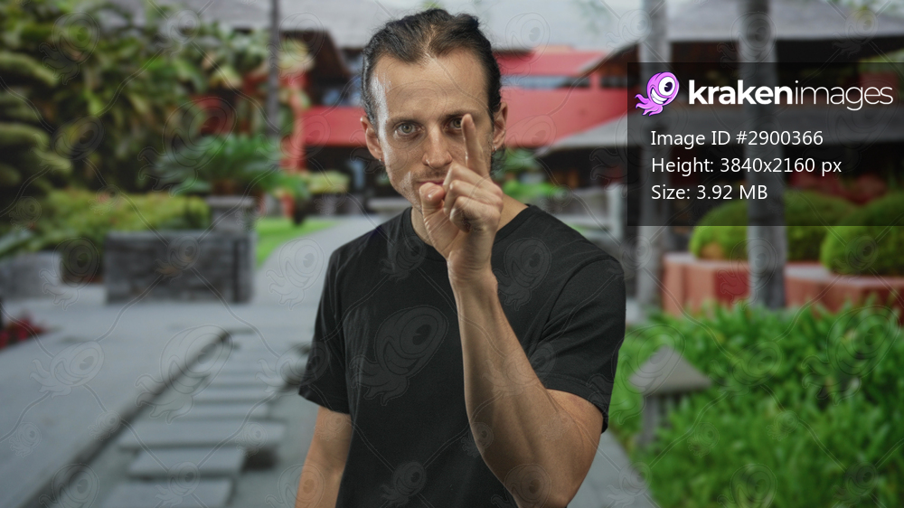 Young hispanic man shows two fingers near face on street in front of building and landscaped walkway; confidence challenge.