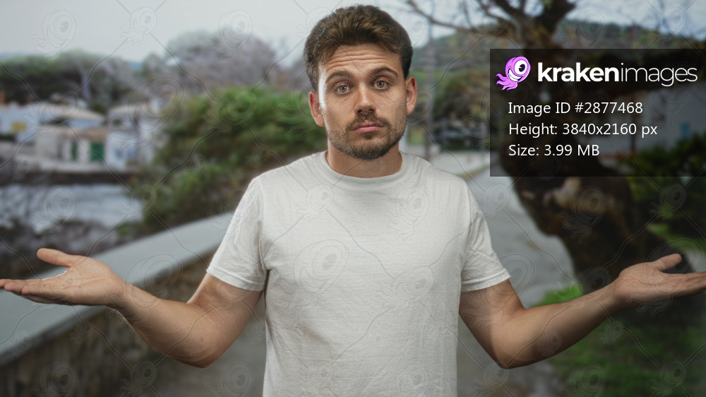 Young hispanic man shrugging with palms up and open arms on a street near a stone wall and tree wearing white t shirt, casual pose; uncertainty.