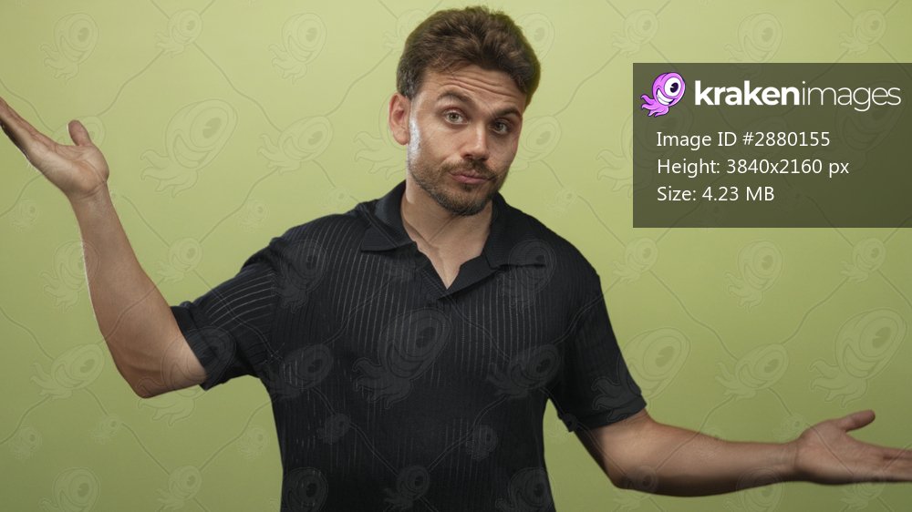 Young hispanic man shrugging with palms up and outstretched arms in light green studio setting; uncertainty.