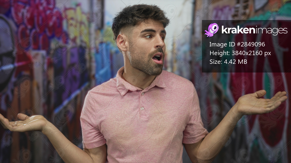Young hispanic man shrugs hands in front of vibrant graffiti wall on outdoor city street; uncertainty.