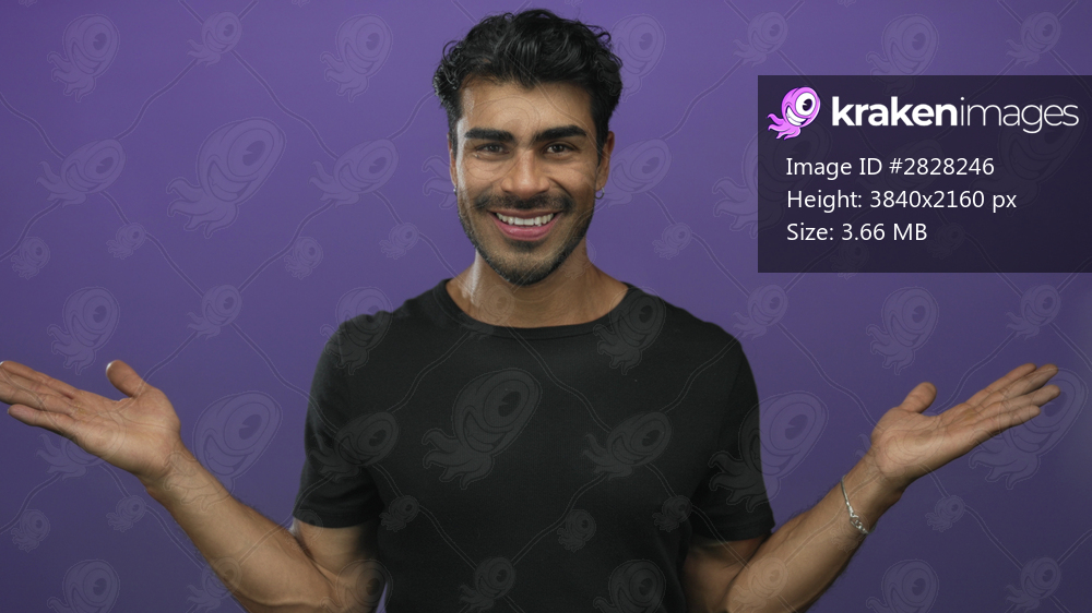 Young hispanic man shrugs with open palms against purple studio wall with a slight smile; uncertainty.
