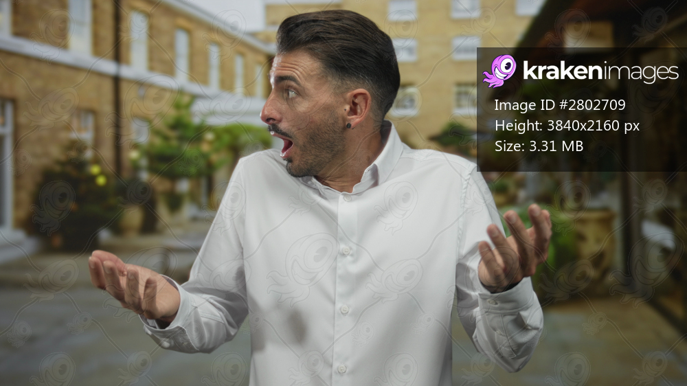 Young hispanic man shrugs shoulders on street outside brick buildings under daylight urban setting; confusion.