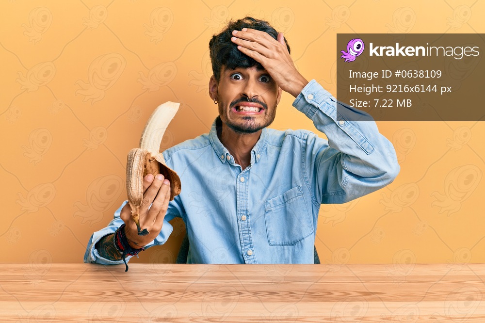 Young hispanic man sitting on the table holding banana stressed and frustrated with hand on head, surprised and angry face