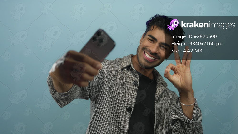 Young hispanic man smiles as he holds a smartphone and makes a peace sign in a studio setting with a blue backdrop; joy.