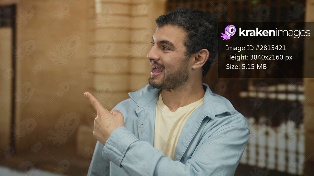 Young hispanic man smiles with bright grin and points finger to building entrance outdoors; excitement.