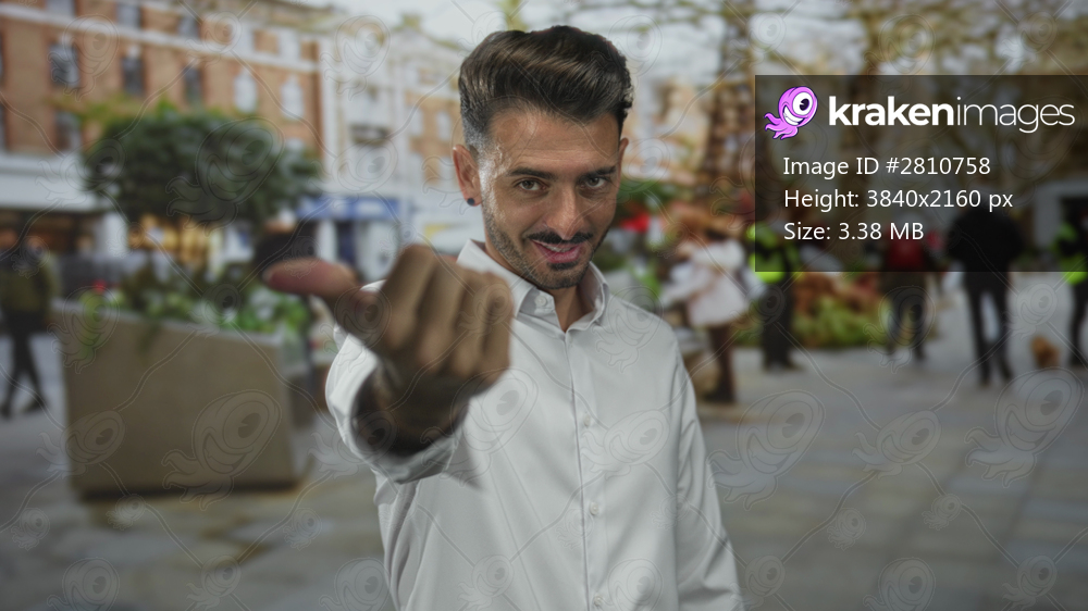 Young hispanic man smiles and gives thumbs up gesture with raised hand on busy city street scene; confidence.