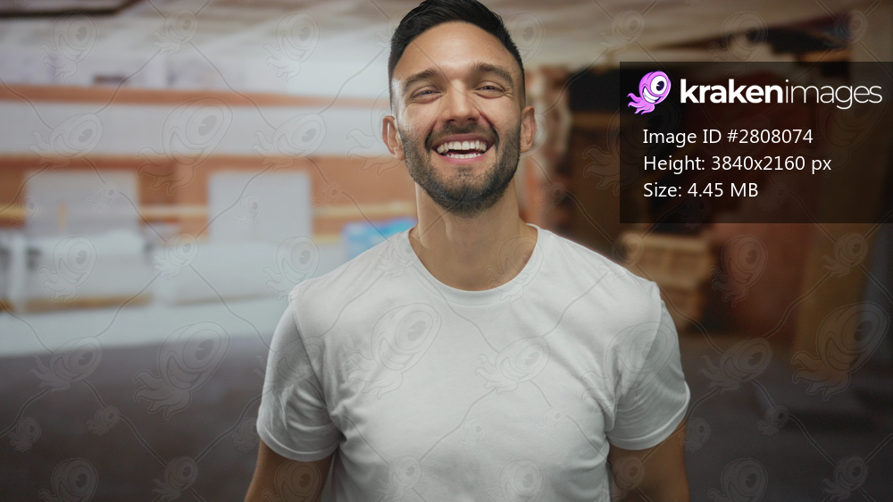 Young hispanic man smiling at a construction site in a white shirt, embodying a positive and confident presence in an unfinished building environment.