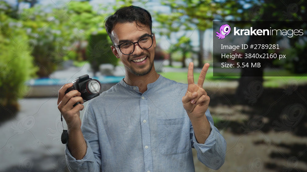 Young hispanic man smiling at camera in a park holding a camera with a peace sign, surrounded by vibrant green nature during daylight.