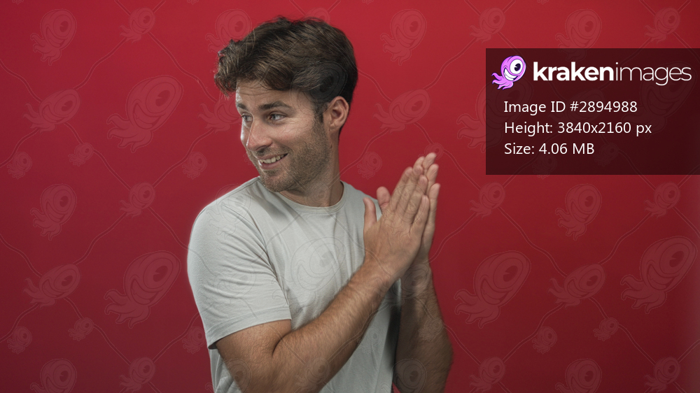 Young hispanic man smiling and clapping hands in a red studio wearing light gray t shirt and looking toward camera; cheerful warmth.