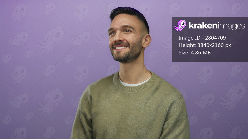 Young hispanic man smiling confidently against a vibrant purple background showcasing positivity and modern style in a casual setting.